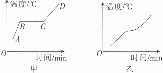 晶体的熔化和凝固的图像有等温线段,表示此过程物体继续吸热或放热,但温度保持不变,即晶体有固定的熔点和凝固点(如图甲中的 $BC$ 线段,平行于横坐标轴);如图乙所示,非晶体没有这样的线段,即非晶体没有固定的熔点或凝固点。