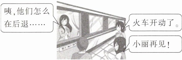 10. 如图所示,这是班上几个同学送小丽乘火车的情景。当火车徐徐开动时,小丽坐在窗边,却看到站台上的几个同学渐渐向后退去,她所选择的参照物是