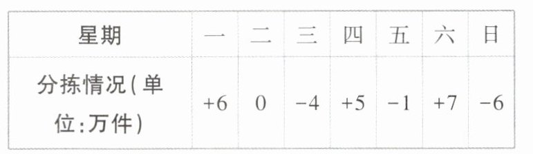 (2)$\frac{1}{7}×[(6+0-4+5-1+7-6)+20×7]=\frac{1}{7}×(7+20×7)=\frac{1}{7}×147=21$(万件)。答:该仓库本周实际平均每天分拣 21 万件包裹。