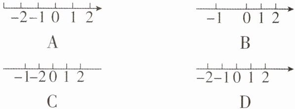D 【解析】A数轴是条直线,而选项A中是射线;B选项B中单位长度不一致;C选项C中原点左侧数字顺序不对,缺少正方向;D符合数轴的概念。