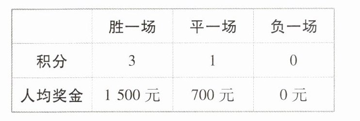 (2)因为每名队员每场比赛出场费为500元,12场比赛出场费共6 000元;胜了4场,奖金为1500×4=6000(元);平了8场,奖金为700×8=5600(元),所以奖金加出场费一共6000+6000+5600=17600(元).答:A队每名队员所得奖金与出场费累计为17600元.