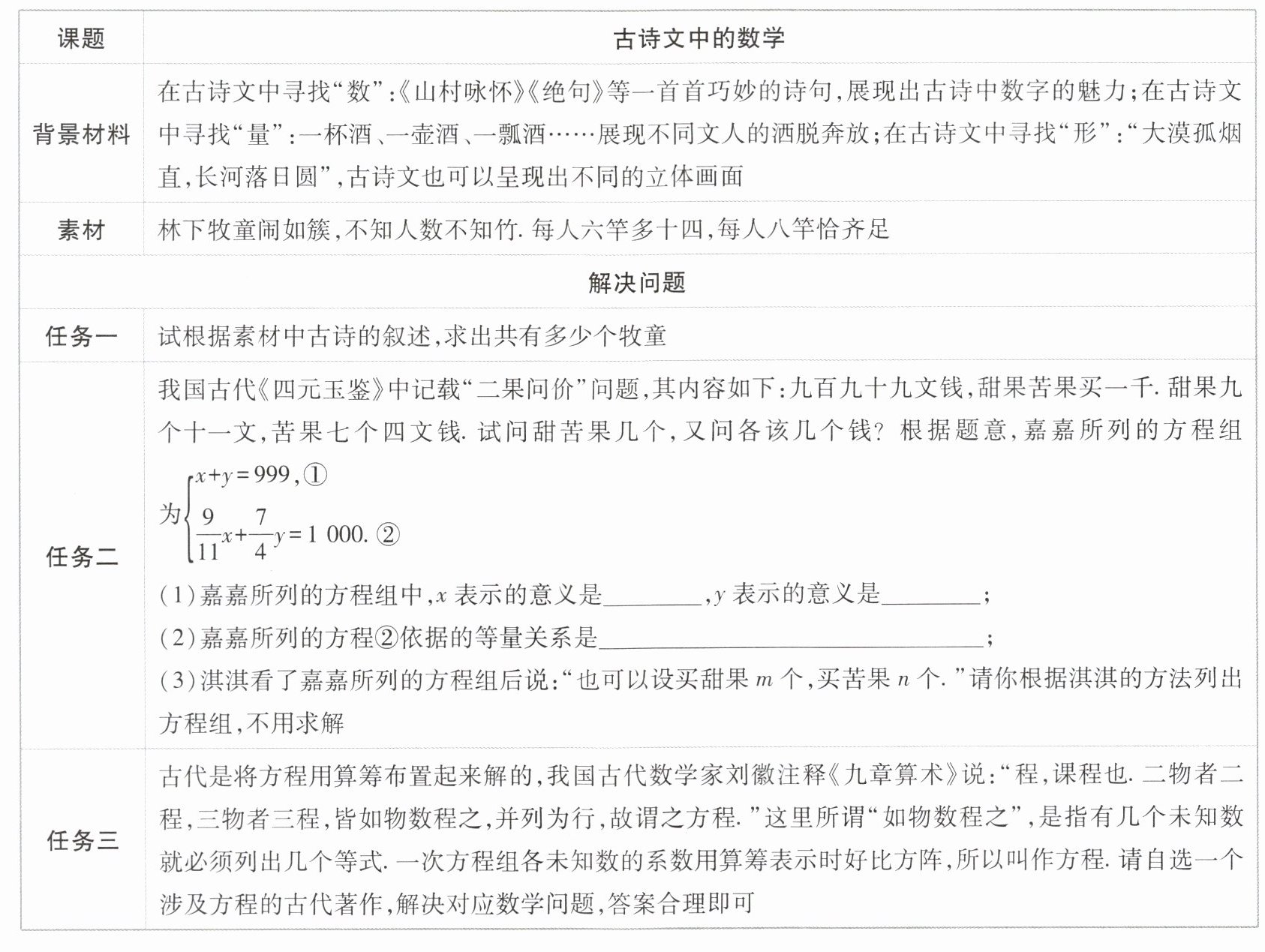 任务一:设共有x个牧童.由题意得6x+14=8x,解得x=7,所以共有7个牧童.