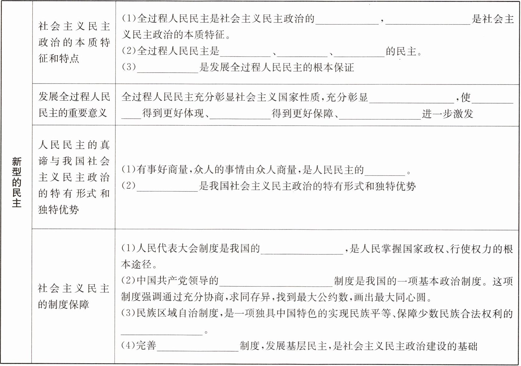 |新型的民主|社会主义民主政治的本质特征和特点|(1)全过程人民民主是社会主义民主政治的______,______是社会主义民主政治的本质特征。