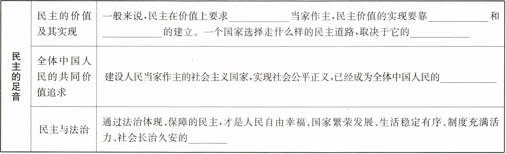|民主的足音|民主的价值及其实现|一般来说,民主在价值上要求______当家作主,民主价值的实现要靠______和______的建立。一个国家选择走什么样的民主道路,取决于它的______|