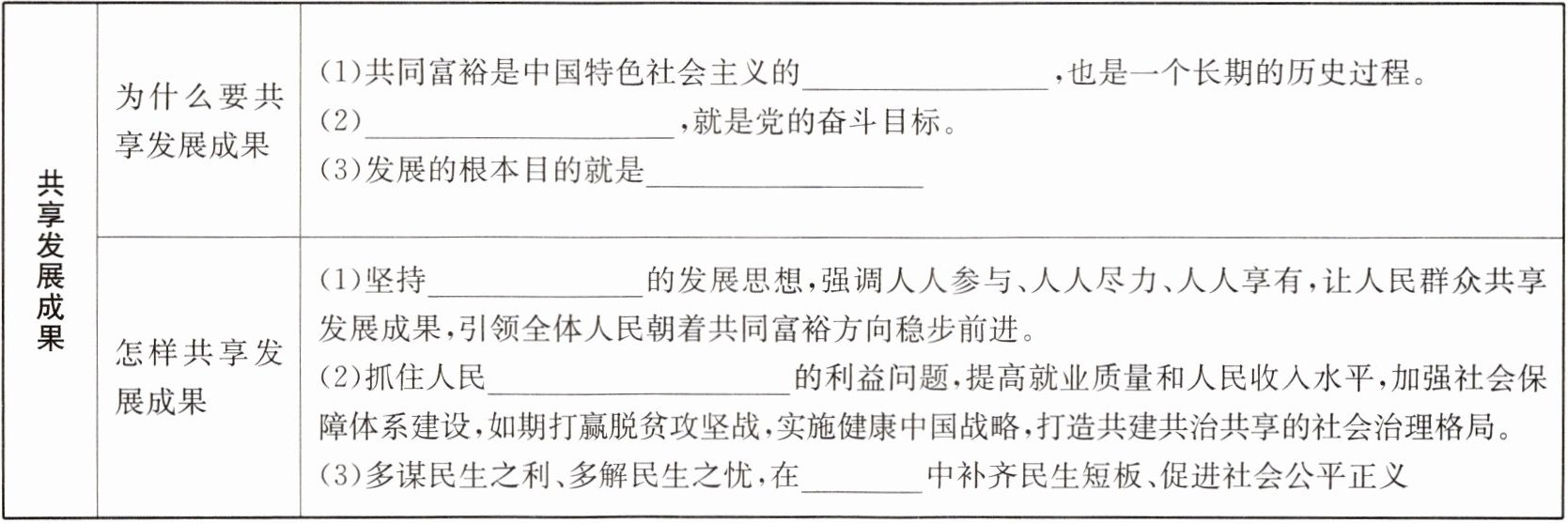 | |怎样共享发展成果|(1)坚持______的发展思想,强调人人参与、人人尽力、人人享有,让人民群众共享发展成果,引领全体人民朝着共同富裕方向稳步前进。(2)抓住人民______的利益问题,提高就业质量和人民收入水平,加强社会保障体系建设,如期打赢脱贫攻坚战,实施健康中国战略,打造共建共治共享的社会治理格局。(3)多谋民生之利、多解民生之忧,在______中补齐民生短板、促进社会公平正义|