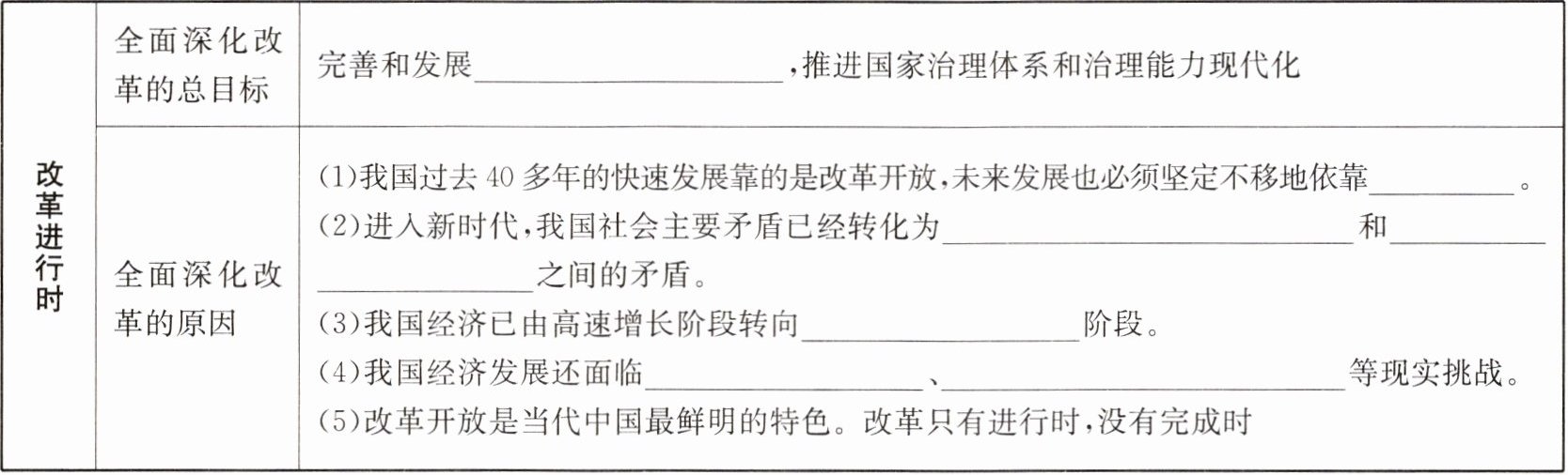 | |全面深化改革的原因|(1)我国过去40多年的快速发展靠的是改革开放,未来发展也必须坚定不移地依靠______。(2)进入新时代,我国社会主要矛盾已经转化为______和______之间的矛盾。(3)我国经济已由高速增长阶段转向______阶段。(4)我国经济发展还面临______、______等现实挑战。(5)改革开放是当代中国最鲜明的特色。改革只有进行时,没有完成时|