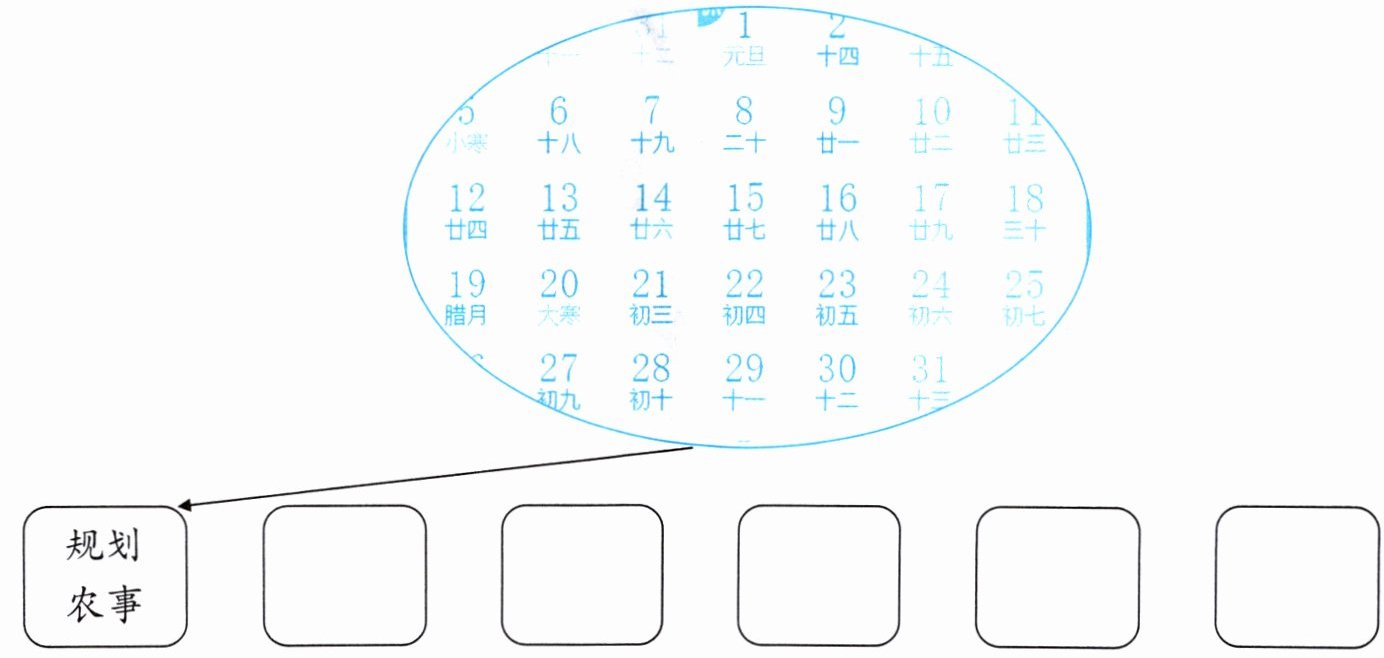 规划农事 -> 小寒、大寒、立春(本题为规划农事,月历中涉及的节气有小寒、大寒,根据实际答题环境,也可写上规划农事对应的具体农事活动,因题目未明确,此处按节气填写)