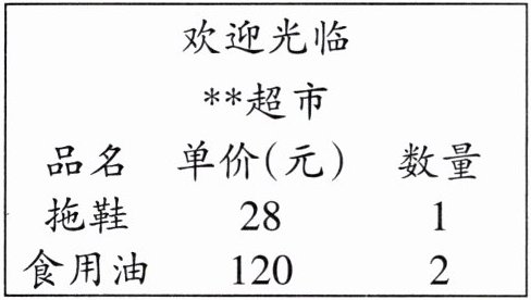 食用油单价$120$元,数量$2$瓶,费用为$120×2=240$元;