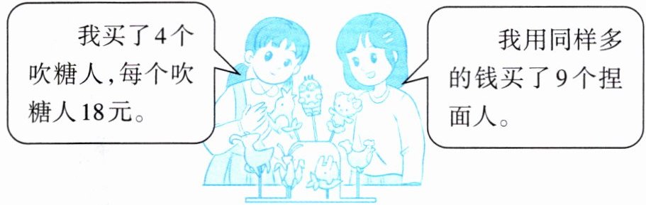 因为买$9$个捏面人的钱和买$4$个吹糖人的钱一样多,都是$72$元,那么每个捏面人的价格 = 总价÷数量,即$72÷9 = 8$元。