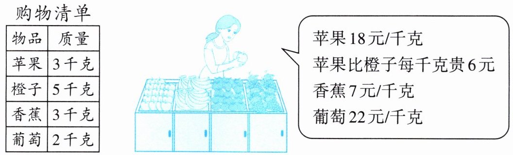 苹果:3千克,每千克18元,苹果总价:$18×3 = 54$(元),