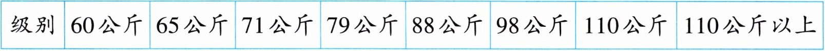 |级别|60公斤|65公斤|71公斤|79公斤|88公斤|98公斤|110公斤|110公斤以上|