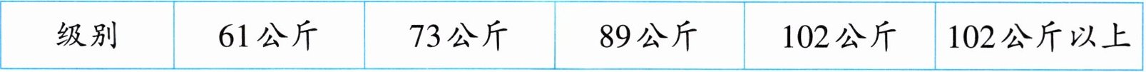 |级别|61公斤|73公斤|89公斤|102公斤|102公斤以上|