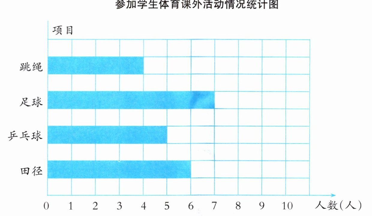 (2)参加田径项目的比参加跳绳项目的多$6 - 4 = 2$人,比参加足球项目的少$7 - 6 = 1$人。
