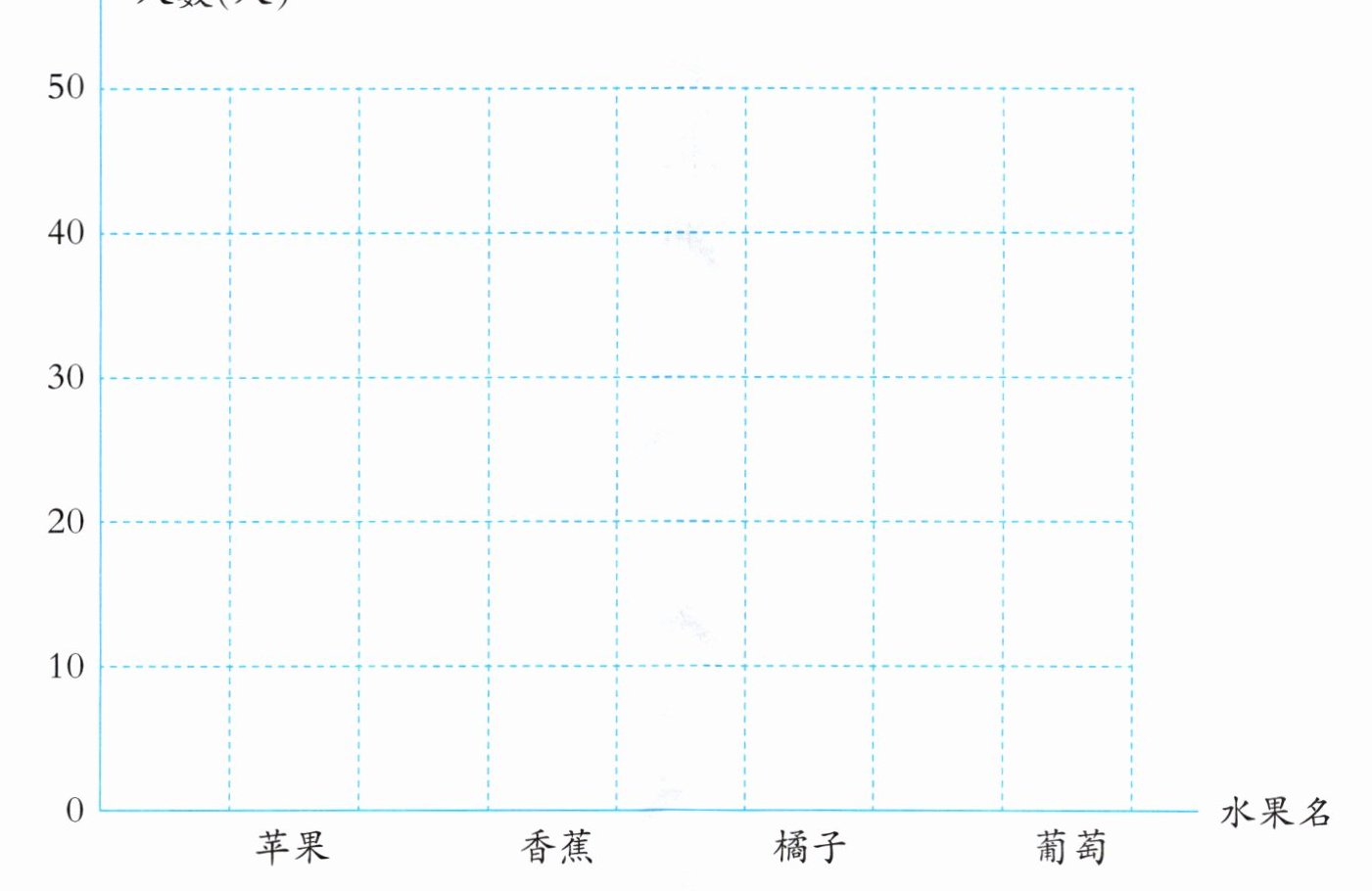 统计图:在对应水果上方涂1个格子(每个格子代表1人)。苹果、香蕉、橘子、葡萄对应的直条高度均为1。