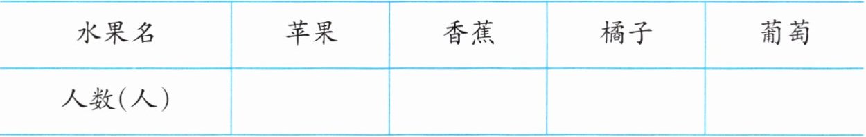 2. 调查你所在小组每个同学对水果的喜好情况(苹果、香蕉、橘子、葡萄),每人只选一种填入统计表中,再制成统计图。