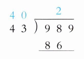 2. 对于$\begin{array}{r}22\\ 43\overline{)989}\\ \underline{86}\\ 129\\ \underline{129}\\ 0\end{array}$(试商$2$,$43×2 = 86$,$98 - 86=12$,余数$12$与下一位$9$组成$129$,$43×3 = 129$),准确商是$23$,这里原题目试商情况有误,按正确计算得出。
