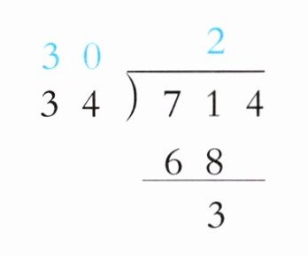 3. 对于$\begin{array}{r}21\\ 34\overline{)714}\\ \underline{68}\\ 34\\ \underline{34}\\ 0\end{array}$(试商$2$,$34×2 = 68$,$71 - 68 = 3$,余数$3$与下一位$4$组成$34$,$34×1=34$),准确商是$21$。