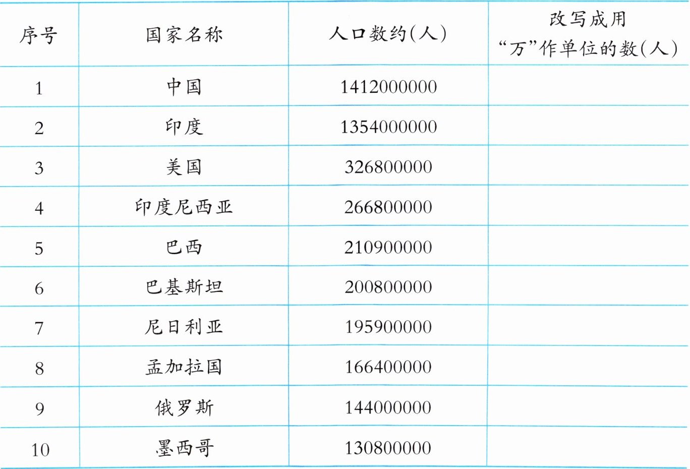 2. 把下面各国的人口数改成用“万”作单位的数。