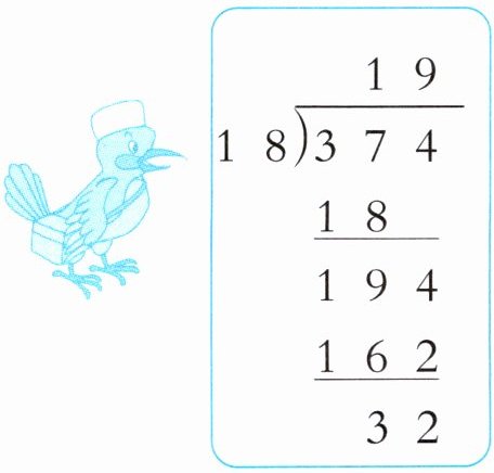 $\begin{array}&2&0\\ 1&8&\overline{)3&7&4}\\ &&3&6\\ \hline&&1&4\end{array}$