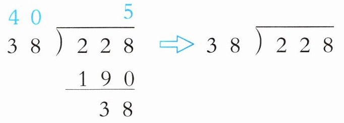 因为$38×5 = 190$,$228 - 190=38$,除到被除数的末尾没有余数,所以准确商是$6$(原试商$5$偏小,调大$1$后为$6$,$38×6 = 228$),应写为$228÷38 = 6$。