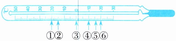 【解析】:温度计刻度以0℃为分界,左边为负数,右边为正数。每大格表示10℃,每小格表示1℃。①在20℃左边第3小格,为-23℃;②在20℃左边第1小格,为-21℃;③在0℃左边第1小格,为-1℃;④在10℃右边第1小格,为11℃;⑤在10℃右边第3小格,为13℃;⑥在20℃右边第1小格,为21℃。