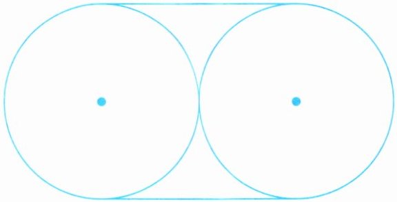 一圈绳子长度:两个半圆弧长之和为一个圆周长,即$C_弧 = \pi d = 3.14 × 5 = 15.7\,cm$;两圆外切,圆心距为$5\,cm$,两条公切线长为$5 × 2 = 10\,cm$,故一圈长度为$15.7 + 10 = 25.7\,cm$。