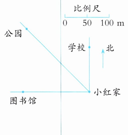 所以小红家到学校的实际距离是$75$米,到图书馆的实际距离是$100$米,到公园的实际距离是$150$米(具体数值需根据实际测量的图上距离计算,这里测量值仅为假设)。