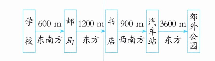 综上,学校到邮局图上距离$1cm$,邮局到书店图上距离$2cm$,书店到汽车站图上距离$1.5cm$,汽车站到公园图上距离$6cm$,再根据方向画图。