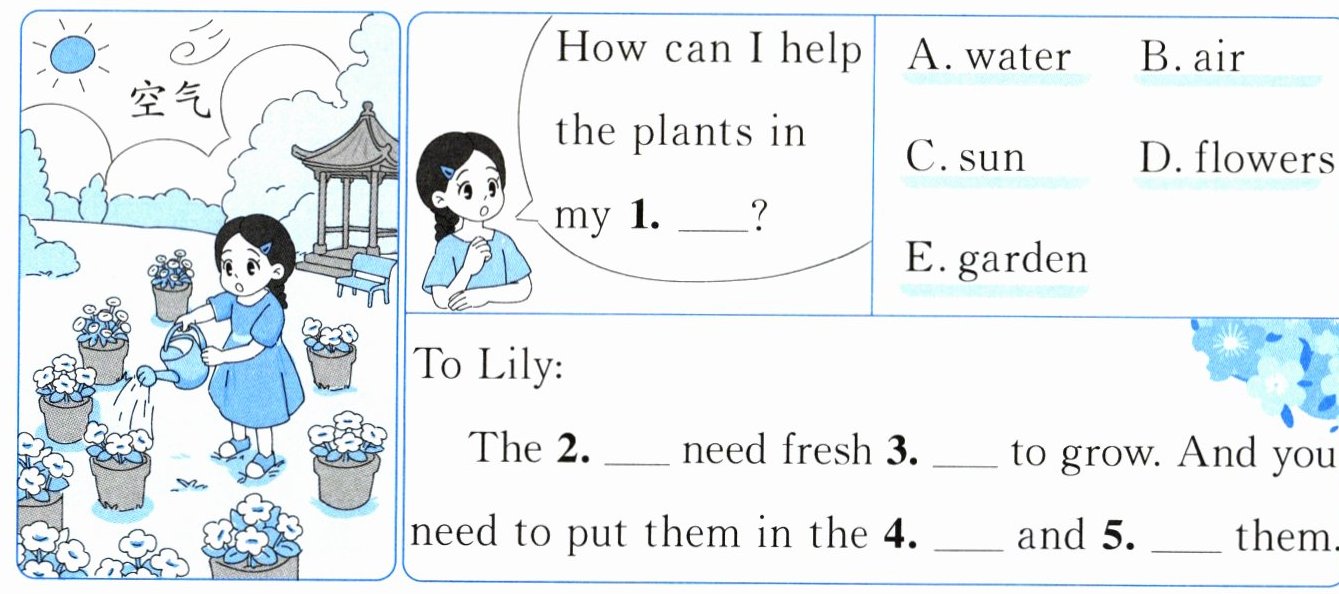 六、Lily想要维护家里的小花园,她该怎么做呢?根据图片,为Lily提供建议,选择正确的词汇填空。(10分)