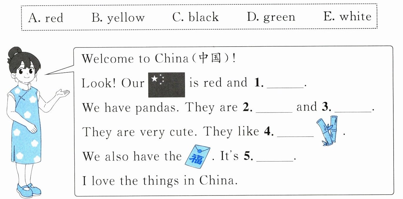 八、国际文化节上,Linda在向来自世界各地的同学们介绍中国。根据图片及句意,选择合适的单词补全语段,将序号写在横线上。(10分)