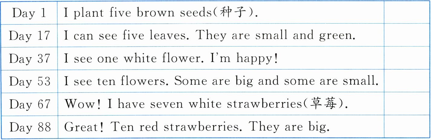 Nina: They grow into 2. ______ small green leaves on Day 17. On Day 37, a 3. ______ flower grows. On Day 88, I get nice strawberries.