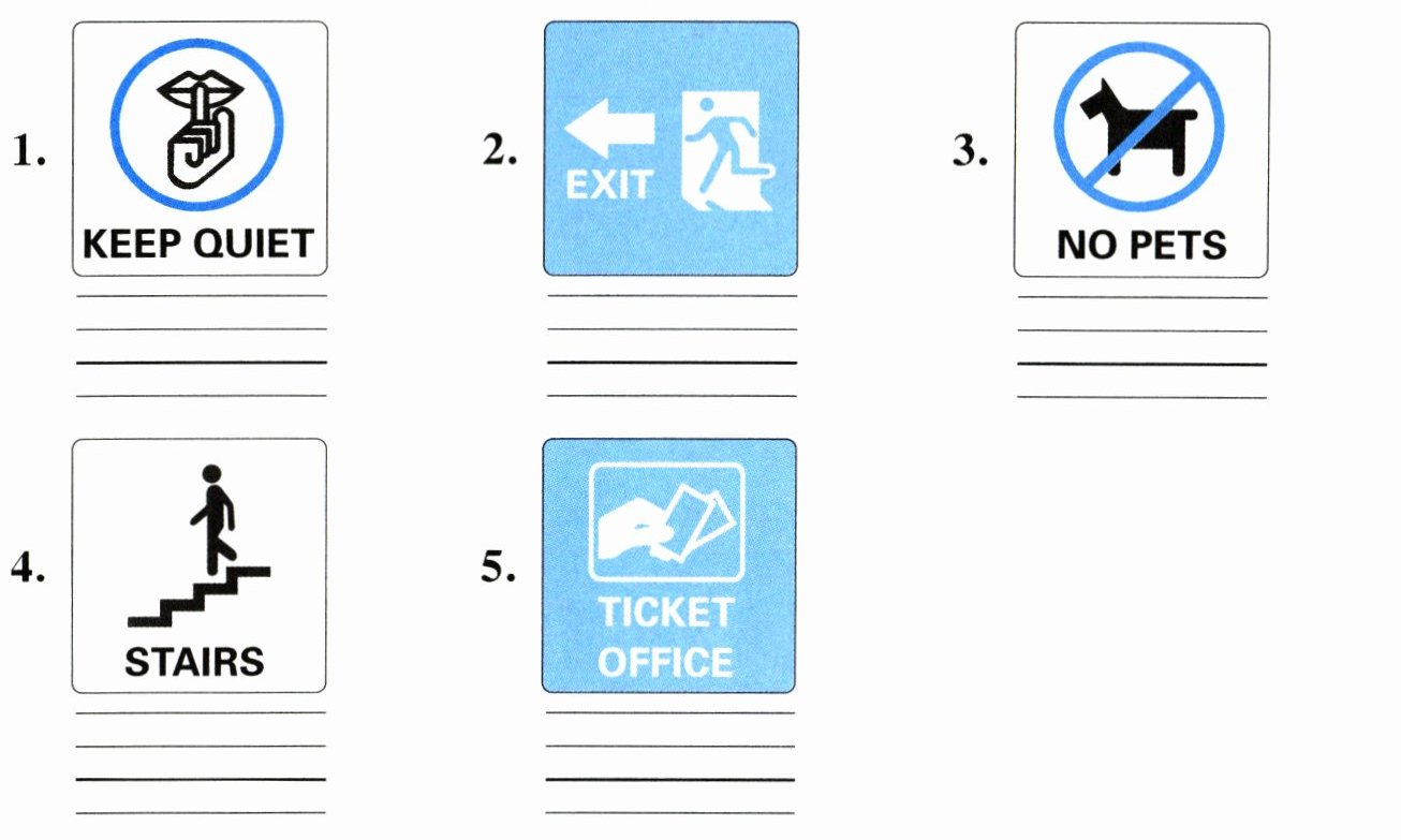 1. keep quiet 2. exit 3. no pets 4. stairs 5. ticket office