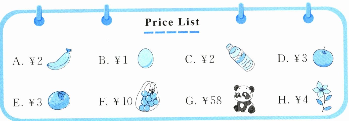 三、三年级(1)班要举办新年派对,同学们准备一起去采购派对所需物品。阅读对话及价目单,完成任务。(10 分)