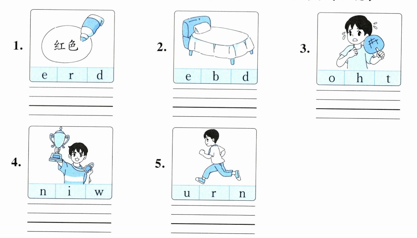 四、看图,将字母组成对应单词,规范书写在四线三格中。(10分)