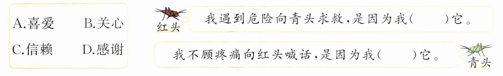 3. 体会红头和青头之间的友谊,选择恰当的词语把它们的对话补充完整。(填序号)