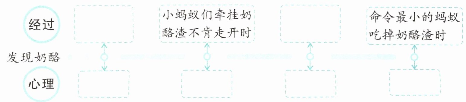 (从上到下)拽掉奶酪一角时 支开小蚂蚁们后 ② ④ ③ ① 示例:我喜欢蚂蚁队长,因为蚂蚁队长最终战胜了自己想偷嘴的心理,命令年龄最小的蚂蚁吃掉奶酪渣,从这件事中我可以看出它以身作则、关爱弱小的美好品质。