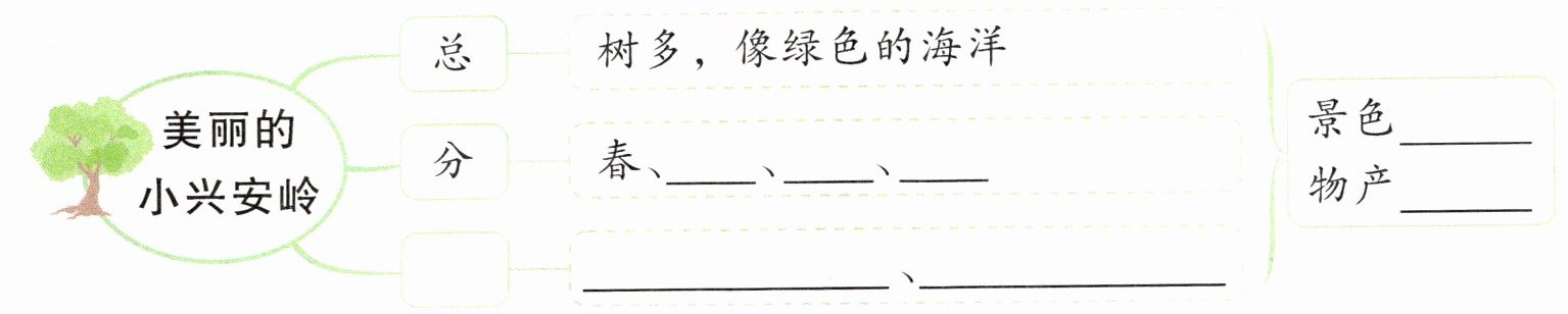 。3. 小兴安岭的森林向人们献出了哪些特产?请完成下面的思维导图。