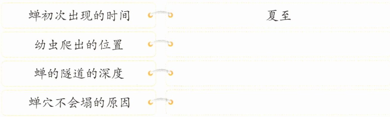 1. 语文要素 作者经过长期细致的观察,发现了蝉的哪些秘密呢?结合短文内容完成导图。