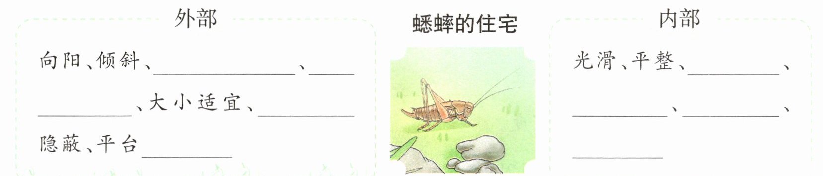 四 新思维 蟋蟀的住宅有哪些特点? 根据课文内容和提示,完成练习。