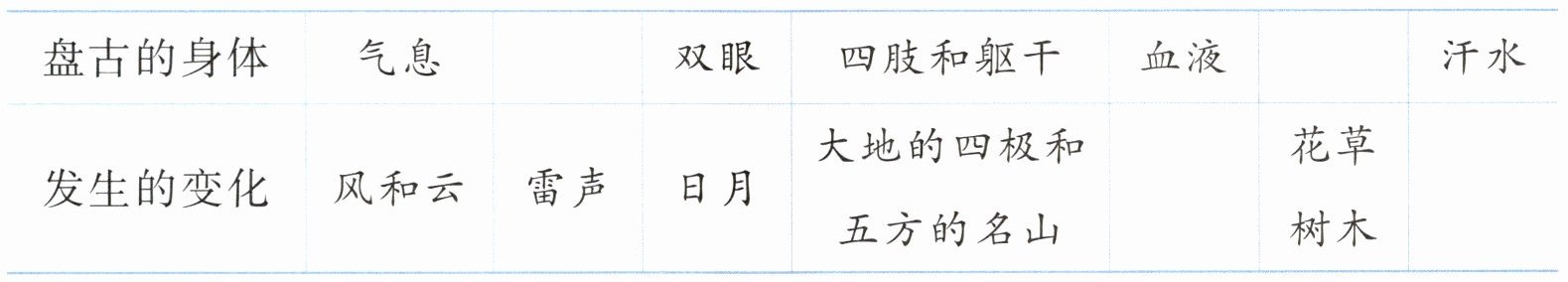 1.盘古倒下以后,他的身体发生了巨大的变化。 2.声音 江河 汗毛 雨露 3.示例:盘古的身体变成了万物,这样的想象既神奇,又展现了盘古勇于献身的精神。