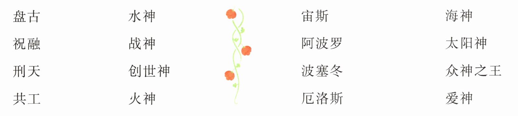盘古-创世神,祝融-火神,刑天-战神,共工-水神,宙斯-众神之王,阿波罗-太阳神,波塞冬-海神,厄洛斯-爱神