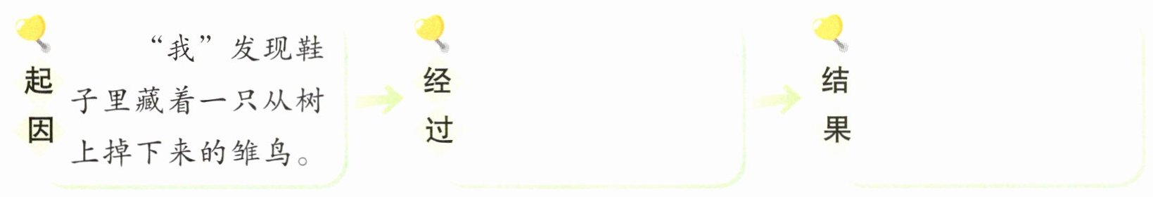 1.经过:“我”把装着雏鸟的鞋放到了大树安全的枝丫上。 结果:鸟妈妈和雏鸟团聚了。 2.①鸟窝太高,“我”爬不了那么高;②雏鸟发蔫,又饿又怕;③雏鸟把“我”的鞋当成了家。 3.把雏鸟还给鸟妈妈 把装有雏鸟的鞋子放在大树安全的枝丫上 善良、聪明