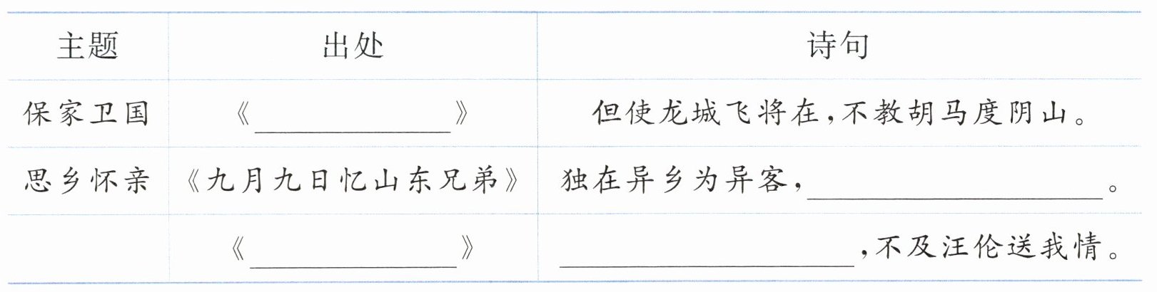 五 新思维 分门别类填古诗。根据提示,补全下面的表格。