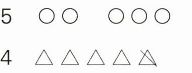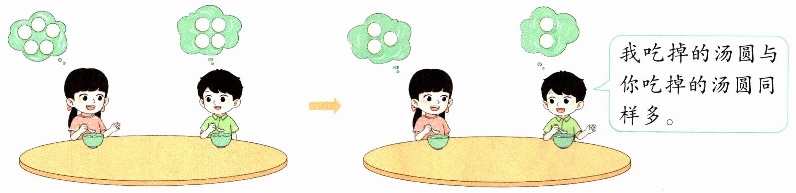 5-3=4-2【解析】观图可得,女孩碗里的汤圆从5个变成3个,可以列式5-3=2来表示女孩吃掉汤圆的数量。男孩碗里的汤圆从4个变成2个,可以列式4-2=2来表示男孩吃掉汤圆的数量。两人吃掉的汤圆同样多,可以用算式5-3=4-2来表示。
