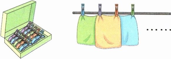 [解析]先数一数,盒子里有10个夹子。按图中所示的方式挂毛巾,可以发现挂1条毛巾需要2个夹子,挂2条毛巾需要3个夹子,挂3 条毛巾需要4个夹子……夹子个数始终比毛巾的数量多1,所以挂9条毛巾需要9+1=10(个)夹子,盒子里的夹子刚好够用。