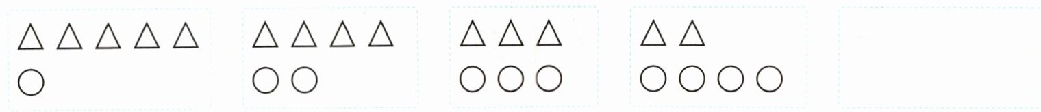 (2)先根据题目中的信息,找出图形的变化规律。第一行的△分别有:5个、4个、3个、2个,依次减少1个;第二行的○分别有:1个、2个、3个、4个,依次增加1个。所以最后一个框中第一行是1个△,第二行是5个〇。依此画图。