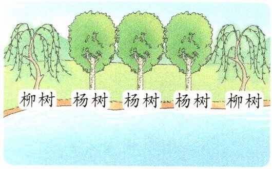 3. 同学们走到湖边时,发现湖边每两棵柳树中间都种了3棵杨树。青青从第1棵柳树走到第5棵柳树下,经过了多少棵杨树?