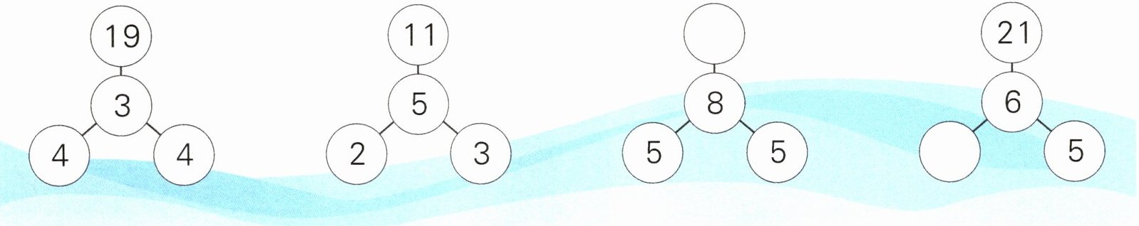 33 3 【解析】通过观察第一、二幅图可以发现,最底层两数相乘再加上中间的数,所得的结果就为最上层的数,那么第三幅图中最上层的数为:5×5+8=33;第四幅图中最下层两个数的积为:21-6=15,想乘法口诀“三五十五”,所以最下层左边的数为3。