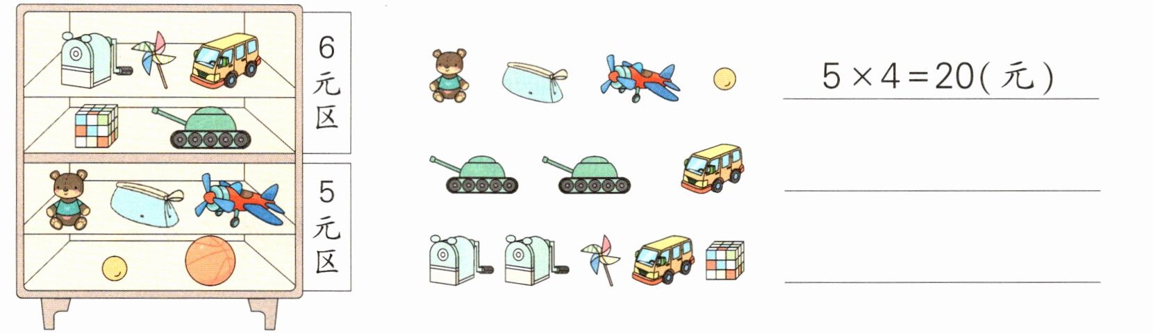 2. 买下面的物品分别需要多少钱?照样子列式计算。