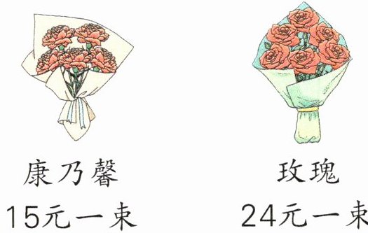 3. 如图,一束康乃馨(xīn)有5枝,一束玫瑰有6枝。如果只买一枝花,那么买哪种花便宜?